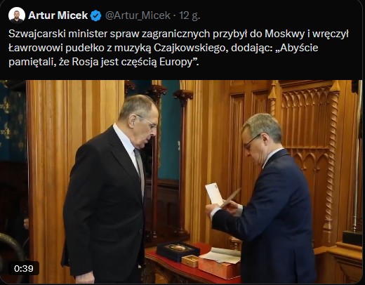 Federacja Rosyjska/Szwajcaria. Szef MSZ Szwajcarii Ignazio Cassis i Sekretarz Generalny Organizacji Bezpieczeństwa i Współpracy w Europie (OBWE) Feridun Sinirlioglu przybyli do Moskwy. Cassis i Sinirlioglu przeprowadzą rozmowy z szefem MSZ Rosji Siergiejem Ławrowem. Poruszone zostaną różne tematy, w tym Ukraina, a także poszukiwanie sposobów na przezwyciężenie obecnego, głębokiego kryzysu w OBWE. Organizacja chce prezentować się jako platforma dialogu między Rosją a Ukrainą. Szef MSZ Szwajcarii Ignazio Cassis wręczył Siergiejowi Ławrowowi „pudełko z muzyką Czajkowskiego”. Powiedział: „Abyście pamiętali, że Rosja jest częścią Europy”.