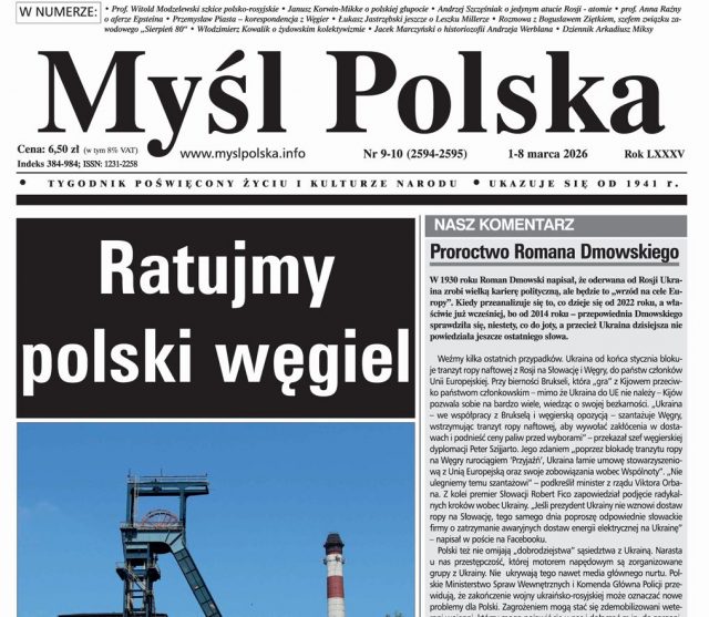 Polska. Wyszedł nowy numer „Myśli Polskiej” (9-10, 1-8.03.2026). W numerze znajdujemy między innymi: prof. Witold Modzelewski, „Ambasador Repnin i jego „godni” następcy”, prof. Stanisław Bieleń, „Gorzkie lekcje wojny”, prof. Anna Raźny, „Epstein twarzą Zachodu”, dr Edward Karolczuk, „Nacjonalizm a nacjonalizm gospodarczy” oraz rozmowę Łukasza Jastrzębskiego z szefem Wolnego Związku Zawodowego „Sierpień 80” Bogusławem Ziętkiem „Węgiel musi wrócić – nawet przy pomocy Amerykanów”.