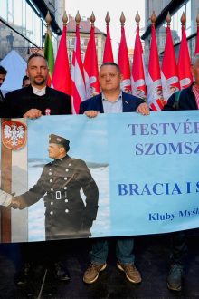 W Budapeszcie spotkaliśmy się z znanymi od lat naszymi Przyjaciółmi z Ruchu Naszej Ojczyzny (Mi Hazánk Mozgalom) oraz ich młodzieżówką Mi Hazánk Ifjai. Z węgierskimi suwerenistami podzielamy praktycznie wszystkie poglądy na czele z oceną sytuacji na Ukrainie i rolą jaką spełnia przywódca tego państwa Wołodymyr Zełenski. Wiele godzin spędziliśmy naszym serdecznym przyjacielem Balázsem Szabó z Ogólnokrajowego Samorządu Polski na Węgrzech (Országos Lengyel Önkormányzat). Obecni byli również przedstawiciele Ruchu Narodowego, Młodzieży Wszechpolskiej i Polskiego Komitetu Słowiańskiego. Udało się również wymienić poglądami z posłem i wiceprezesem Mi Hazánk Mozgalom Dávid Dócsisem i wiceszefem węgierskiego parlamentu Dórą Dúró jak i większością liderów tego ruchu. Na największym jak do tej pory wiecu Mi Hazánk Mozgalom towarzyszyły nam transparenty „Klub Myśli Polskiej” oraz „Testvérek és szomszédok – bracia i sąsiedzi – Kluby Myśli Polskiej”. Zwłaszcza ten drugi wzbudzał zainteresowanie, bo był zilustrowany barwnym zdjęciem z 1939 roku z granicy polsko-węgierskiej na Przełęczy Użockiej. Towarzyszył nam również sztandar Stowarzyszenia Spadkobierców Polskich Kombatantów II Wojny Światowej.